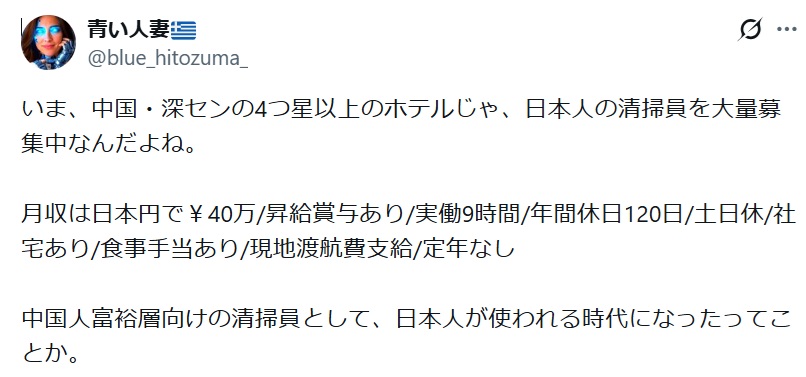 これかな。勤務地の書き方が紛らわしいが、本社が東京で勤務地は深圳のようだ。これが怪しい会社でないなら、ワーホリ感覚で食費・住居費無料で月40万円もらって数年働いて中国語を少々マスターして次の展開を狙う若者とかいそう。