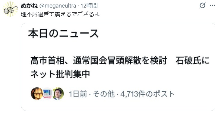 あと数か月以内に、統一教会の解散命令もでて、サナエがしでかした外交経済の失敗が暮らしに反映して明らかになり、国会が始まるとサナエ首相が「統一教会問題」で集中攻撃をうけるから、支持率が落ちるからその前に解散するらしい。