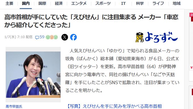 高市首相が手にしていた「えびせん」に注目集まる メーカー「車窓から紹介してくださった」