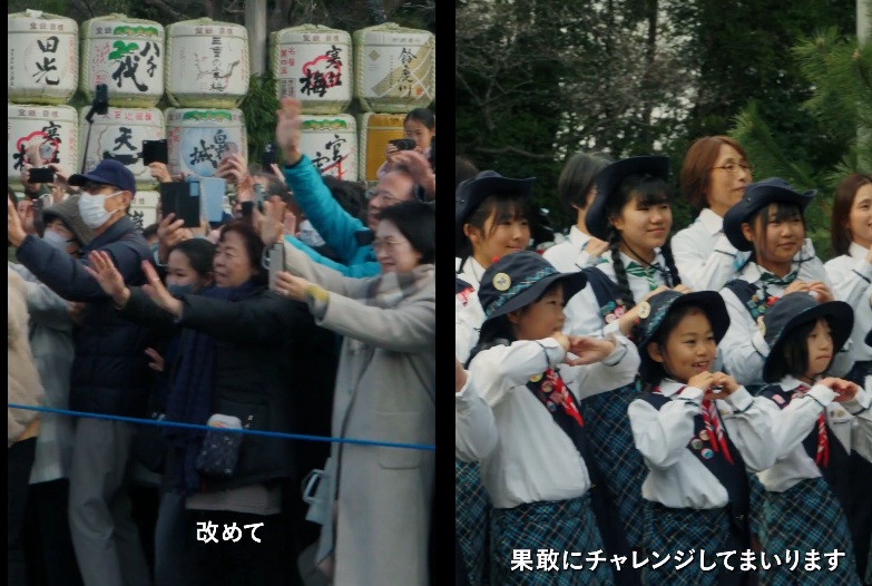 このアングル。皇族の参拝のよう。しかも子供たちを動員させて伊勢神宮参拝で花束贈呈?