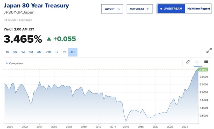 日本の30年国債利回りが3.465%に急上昇、史上最高水準に
