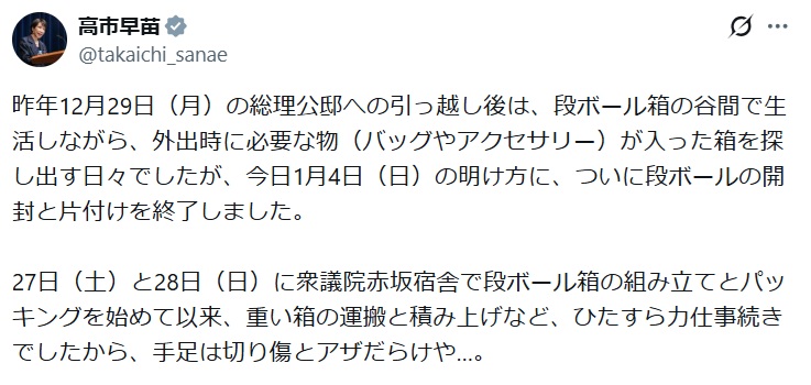 午後は、ようやく荷解きに着手しましたが、途中でダンナさんの食事の仕度や食器洗いなどもあり、荷解きは台所や風呂場やトイレの用品など生存に必要な数箱で断念。2日(金)は、年頭記者会見の原稿準備をしていたら、急に米国のトランプ大統領との電話会談がセットされる事になり、総理秘書官達の他、正副官房長官、外務事務次官、国家安全保障局長なども交えて打合せの後、電話会談とぶら下がり記者会見。