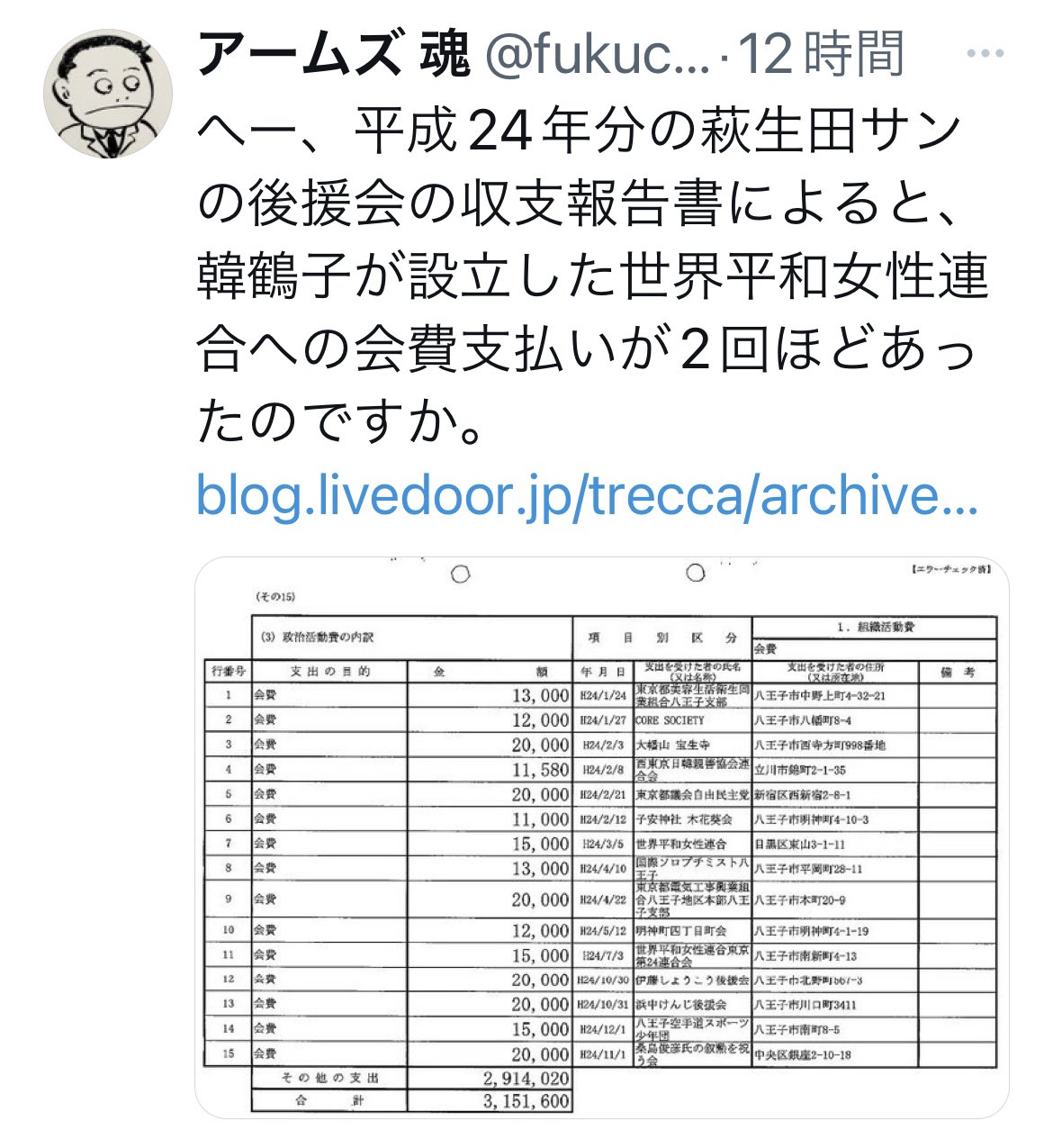 平成24年 世界平和女性連合(韓鶴子が設立)への会費支払い