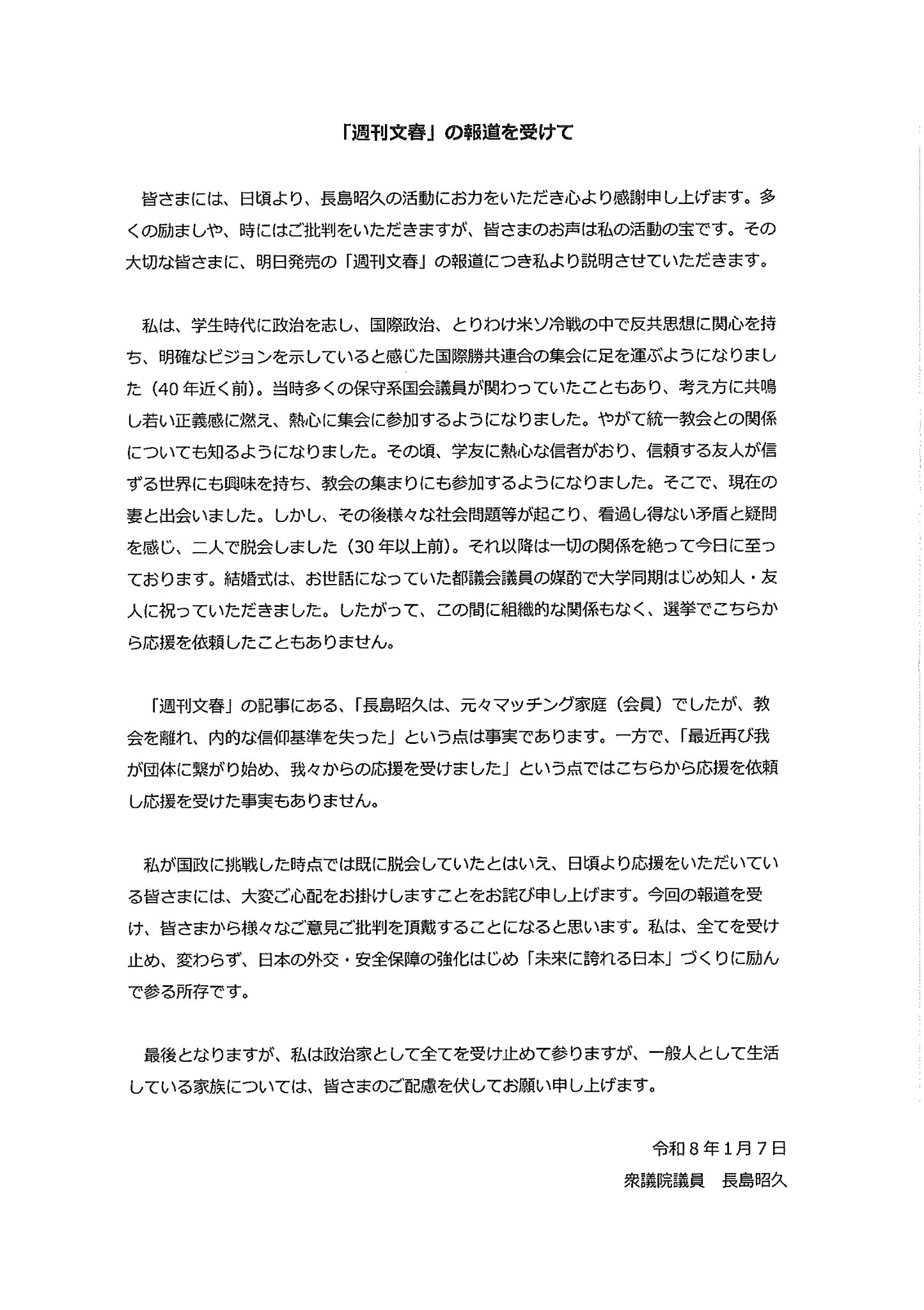 「週刊文春」の記事にある、「長島昭久は、元々マッチング家庭 (会員)でしたが、教会を離れ、内的な信仰基準を失った」という点は事実であります。一方で、「最近再び我が団体に繋がり始め、我々からの応援を受けました」という点ではこちらから応援を依頼し応援を受けた事実もありません。