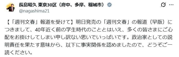 皆さまには、日頃より、長島昭久の活動にお力をいただき心より感謝申し上げます。多くの励ましや、時にはご批判をいただきますが、皆さまのお声は私の活動の宝です。その大切な皆さまに、明日発売の「週刊文春」の報道につき私より説明させていただきます。