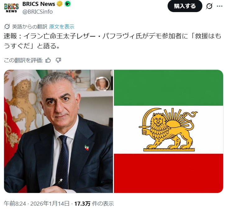 イラン亡命王太子レザー・パフラヴィ氏がデモ参加者に「救援はもうすぐだ」と語る
