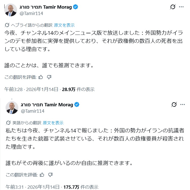 投稿者はイスラエルの右派寄りテレビ局 Channel 14 のジャーナリストです