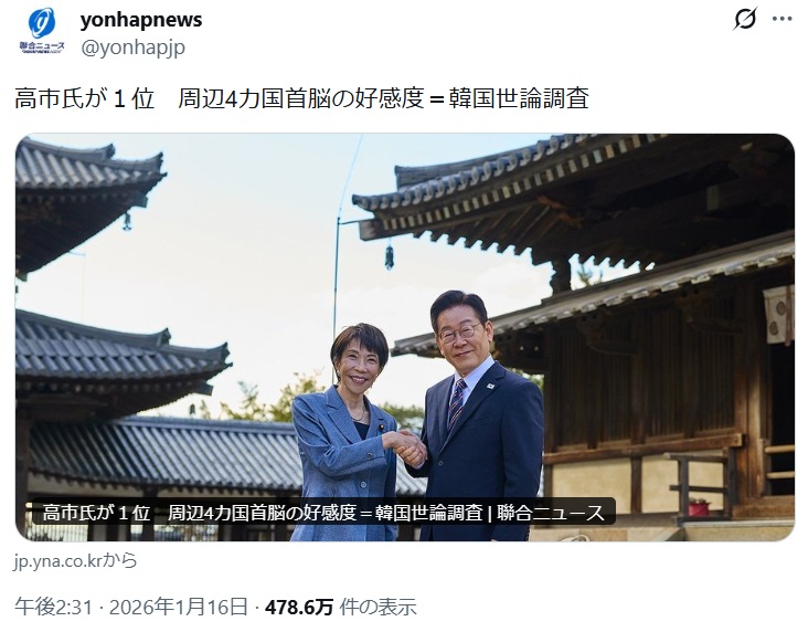 高市さんどうこうっていうより、韓国においてトランプより習近平のほうが好感度が高いことがニュースな気がする。