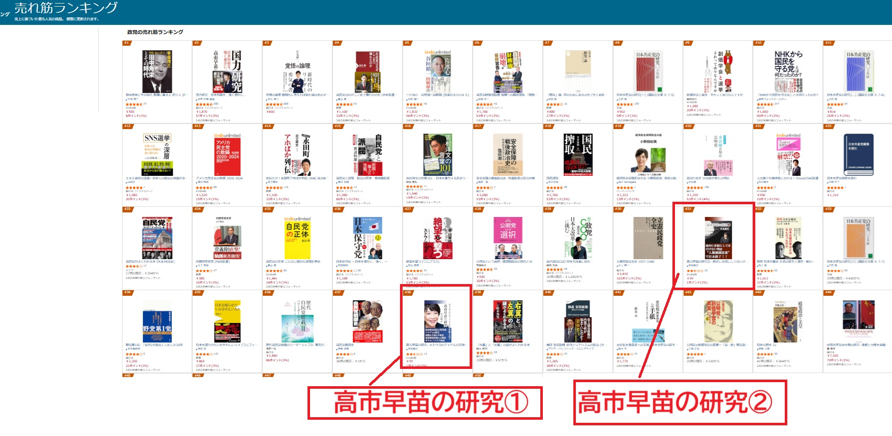 他の拙著、例えば、高市早苗の研究②だと、売れ筋ランキングやジャンルも表示されます。