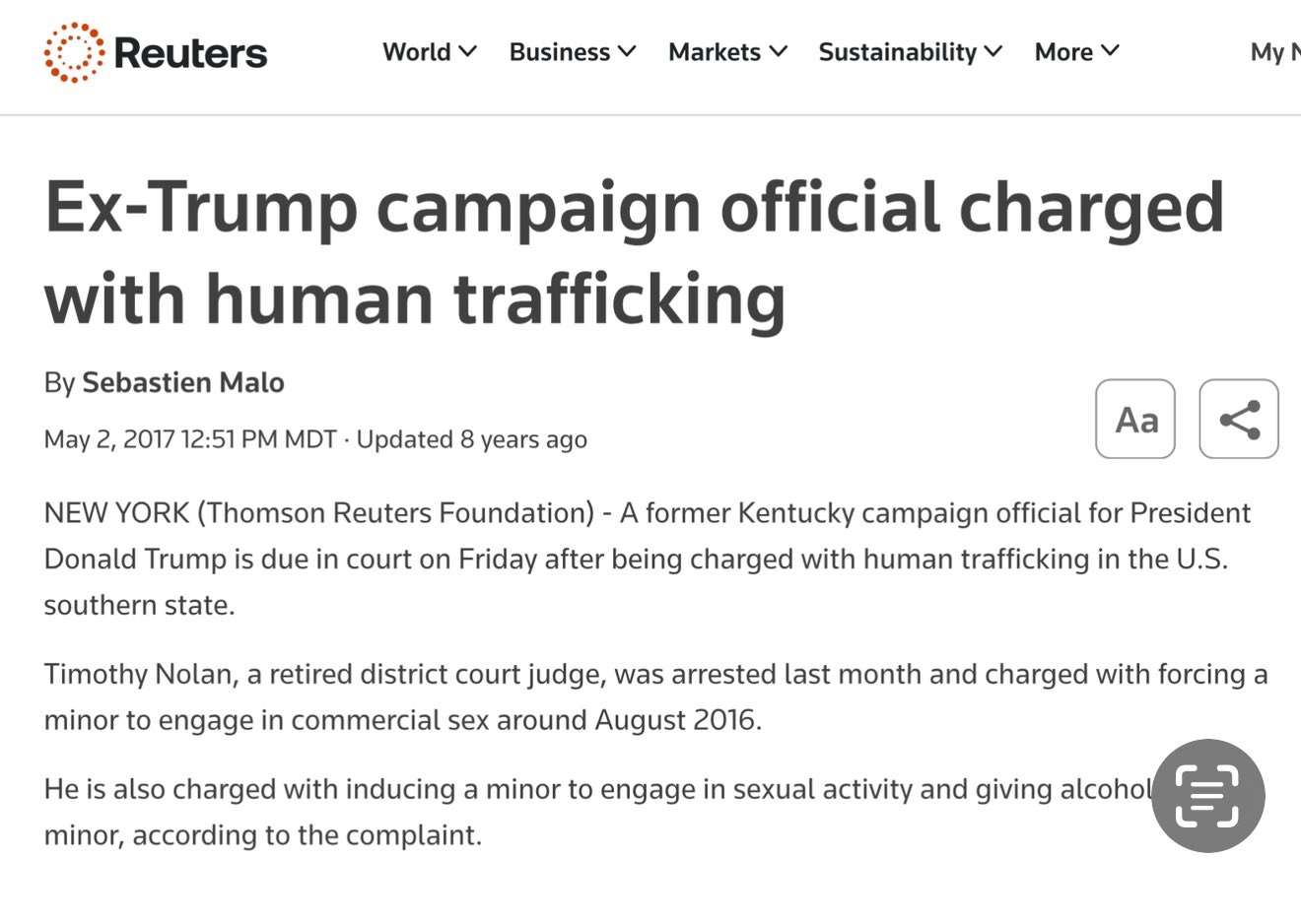 ニューヨーク(トムソン・ロイター財団) – ドナルド・トランプ大統領の元ケンタッキー州選挙対策本部幹部が、米国南部ケンタッキー州で人身売買の罪で起訴され、金曜日に出廷する予定だ。元地方裁判所判事のティモシー・ノーラン氏は先月逮捕され、2016年8月頃に未成年者に商業的な性行為を強要した罪で起訴された。訴状によると、ノーラン氏は未成年者を性行為に誘引し、未成年者にアルコールを飲ませた罪でも起訴されている。