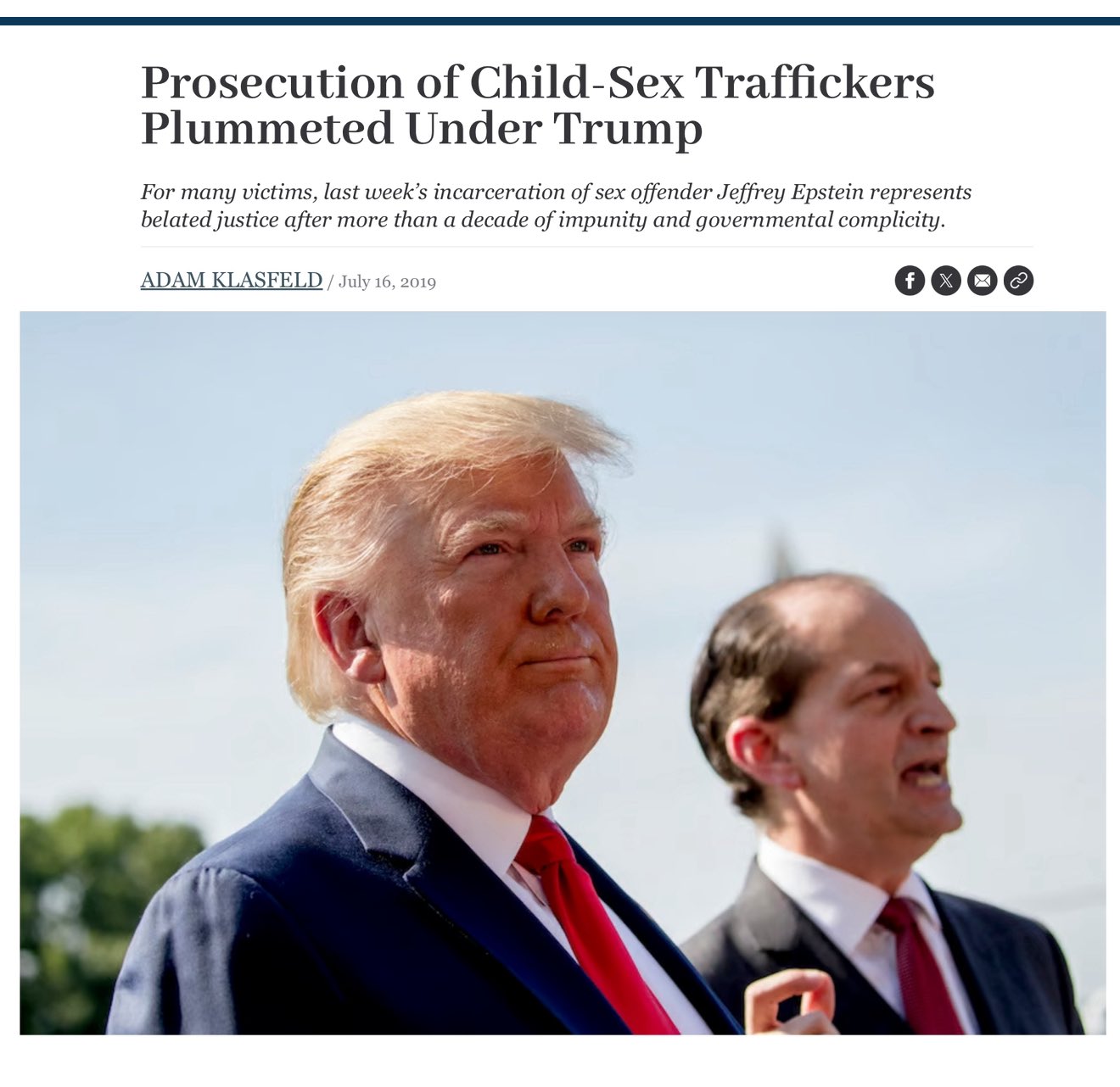 「トランプ政権下で児童性的人身売買業者の訴追が急減 多くの被害者にとって、先週の性犯罪者ジェフリー・エプスタインの収監は、10年以上にわたる不処罰と政府の共謀の後で遅ればせながらの正義を表している」