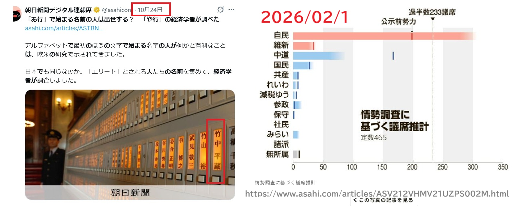 中高年はオールドメディア(朝日新聞の予測「自民圧勝」)、若い人はSNSでエコーチェンバー。タケナカ平蔵もサナエも国を乗っ取りに来てるね。カラー革命だよ。これ。