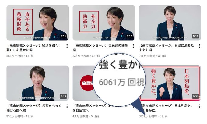 いくら高市さん人気でも6千万視聴はありえないですね。自民党がスマホ・ファームに依頼したらやりすぎちゃったんですかね