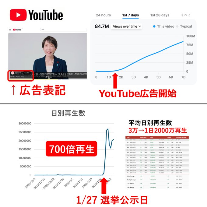 あと1日3万前後しか再生数のなかった自民党チャンネルが、選挙公示日からいきなり700倍も再生される訳がないからな。