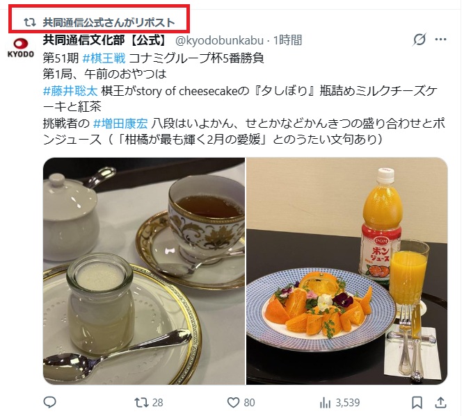 自分でリポストしてるということは、知ってほしいニュースが「棋士のおやつ」。