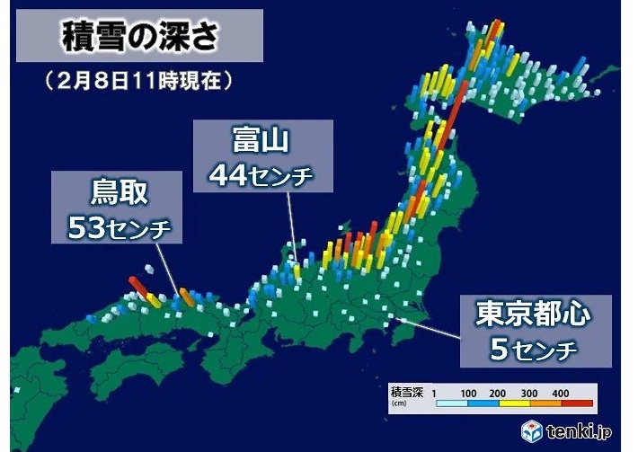 日本海側では警報級の大雪となっており、普段雪の少ない関東など太平洋側でも積雪となっています。このあとも日本海側では雪が強く、平地でもさらに積雪が増えるでしょう。車の立ち往生など交通障害に警戒が必要です。太平洋側でも積雪が増える所があるでしょう。今日8日(日)は衆議院議員総選挙の投開票日ですが、積雪や路面の凍結に注意が必要です。