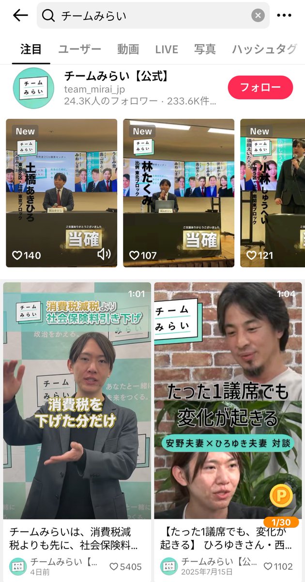 チームみらいの謎の躍進は、Xじゃなくてtiktokなのかと思って調べてみたら、フォロワーなんて2万4千しかいないし、動画も何一つバズってない