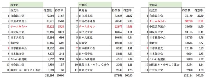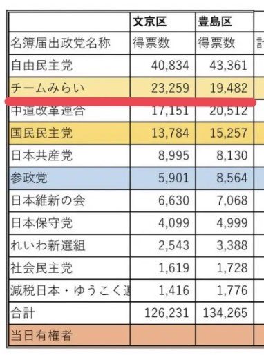 東京5区、6区は、チームみらいがなんと比例で2位です