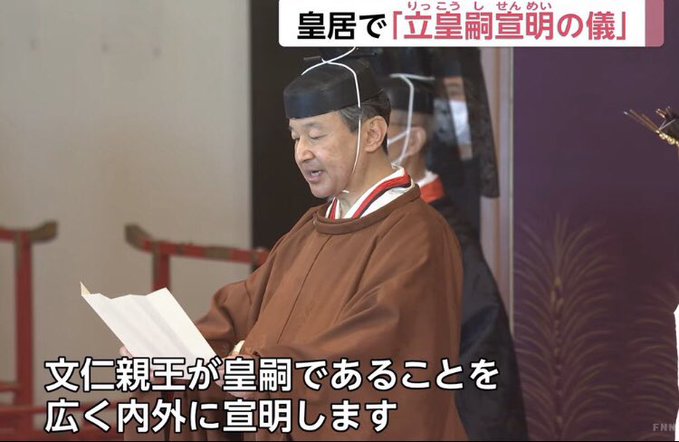 126代天皇・ナルちゃん(浩宮徳仁の代理人)「文仁親王が皇嗣であることを広く内外に宣明します」