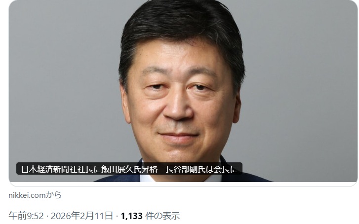 『日本経済新聞社社長に飯田展久氏昇格 長谷部剛氏は会長に』 2026年2月10日 「日本経済新聞社は10日、飯田展久専務(62)が社長に昇格する人事を内定した。長谷部剛社長(68)は代表権のある会長に就く。岡田直敏会長(72)は顧問となる」