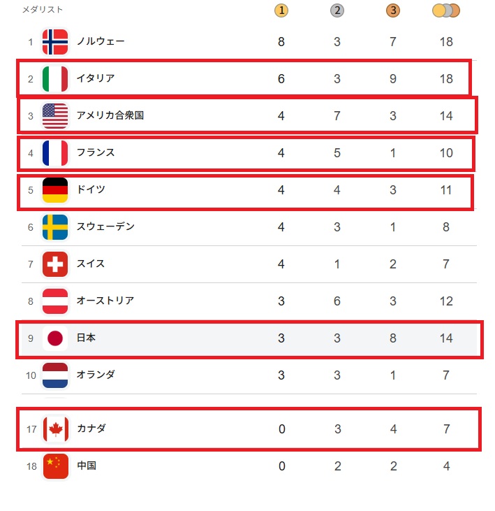 赤枠はG7。G7以外は冬五輪だから仕方なのでしょうが、上位10位は北欧州が独占してます。北国のはずのカナダは17位、人口がが多い夏五輪は無双の中国は18位。