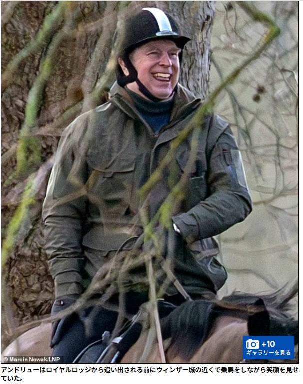 「アンドリューはロイヤルロッジから追い出される前にウィンザー城の近くで乗馬をしながら笑顔を見せていた」