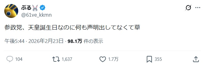 午後5:44 参政党、天皇誕生日なのに何も声明出してなくて草。