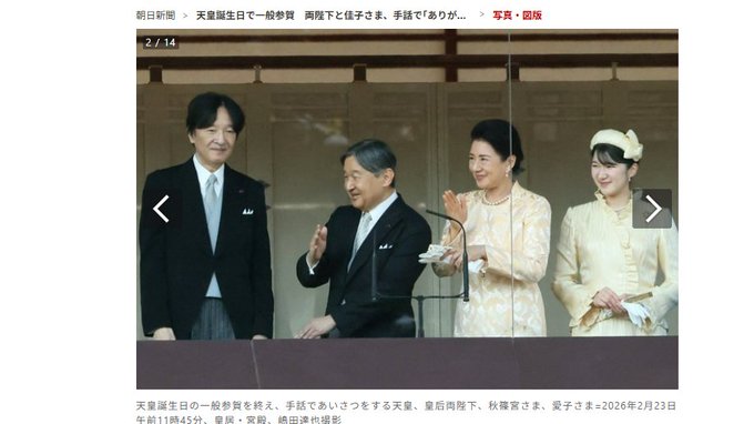 天皇誕生日の一般参賀を終え、手話であいさつをする天皇、皇后両陛下、秋篠宮さま、愛子さま