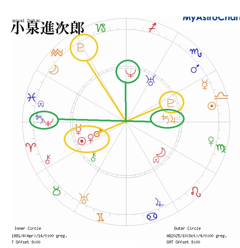 進次郎の場合、グローバルカルトの支配下にある時期です。橋下元大阪知事がこれを作ってる間は現役でした。しかし冥王星が進行し180度衛が解けたら引退しました。進次郎はまだ「お勤め」が続くでしょう。