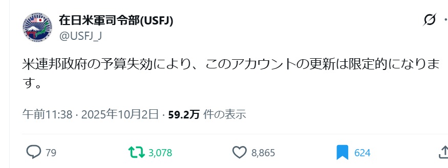 「米連邦政府の予算失効により、このアカウントの更新は限定的になります」