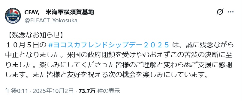 米連邦政府の予算が議会で承認されず、2025年10月1日から政府機関の一部がシャットダウン状態になりました。これにより、非必須の活動が停止し、在日米軍司令部のアカウント更新も制限されています。必須の軍事活動は継続しますが、民間職員の多くが休暇扱いとなります。詳細は国防省のガイドラインをご確認ください