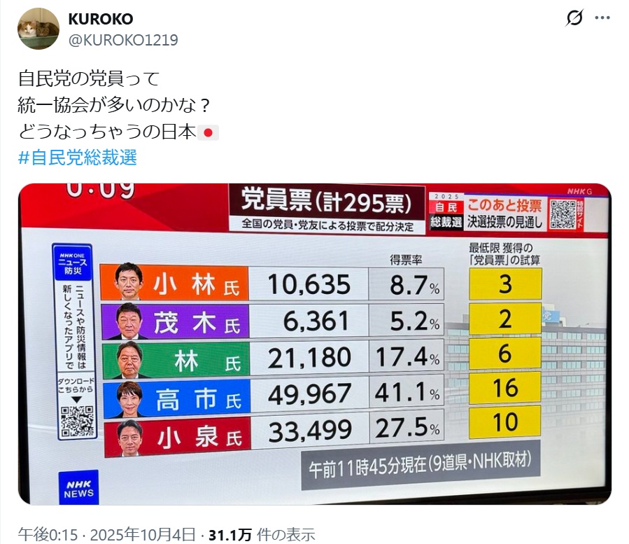 これ、すごいな。僅か5万人弱の人の意見で、一国の首相が決まっちゃうのか。統一協会員が60万人だから、その人たちの一部が自民党員になっていたとしたらと考えると、とても恐ろしい。