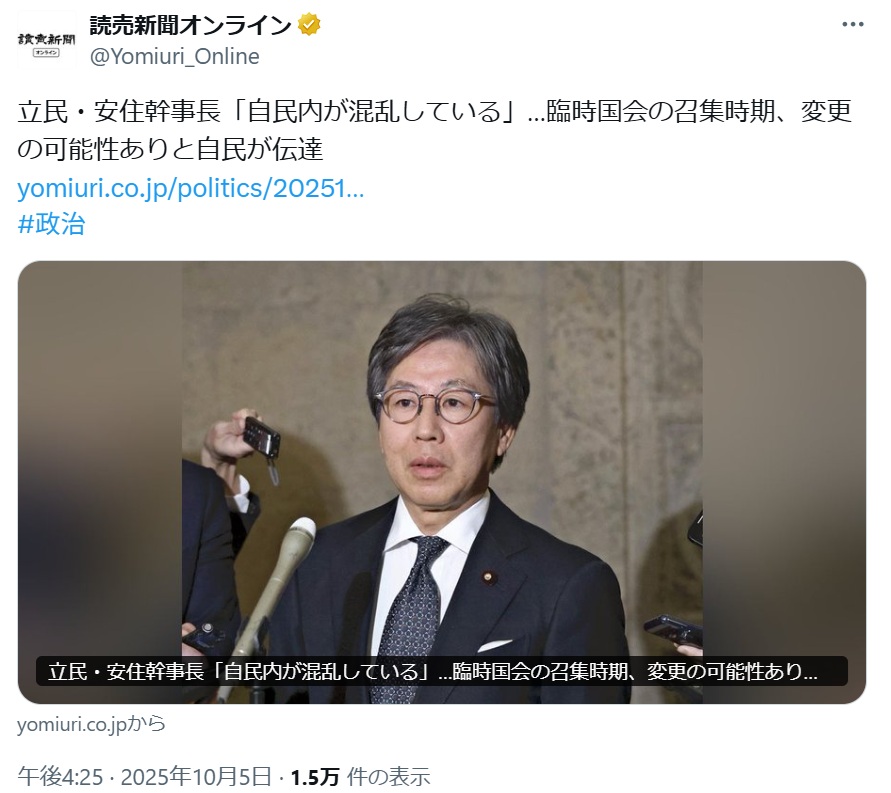 立憲幹事長「自民党内が混乱し、臨時国会の日にちが決まらない」