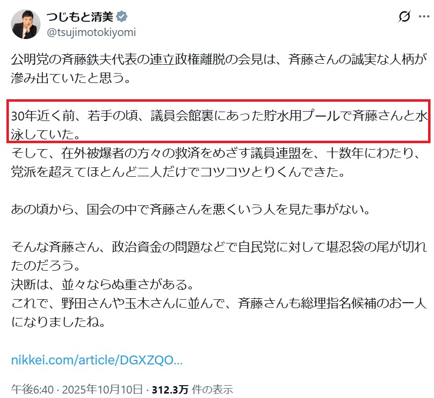 辻本清美議員「30年近く前、若手の頃、議員会館裏にあった貯水用プールで斉藤さんと水泳していた」