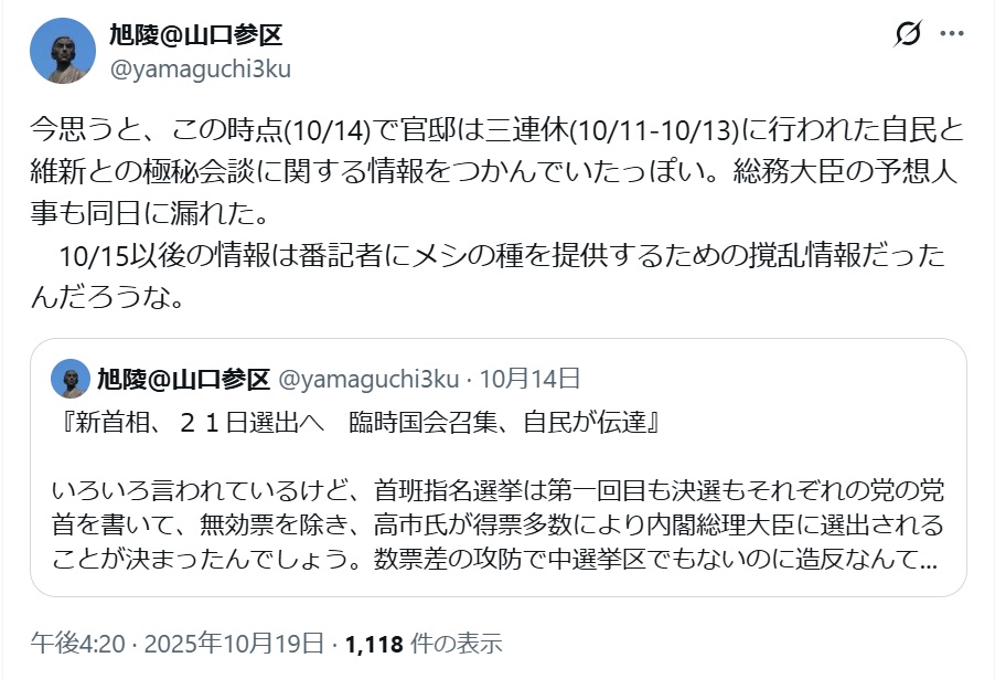 無事にサナエが維新票で首相になっても、次の選挙では、サナエを支持した選挙に弱い議員たちは、公明との連立がないため、全滅する算段になるらしい。