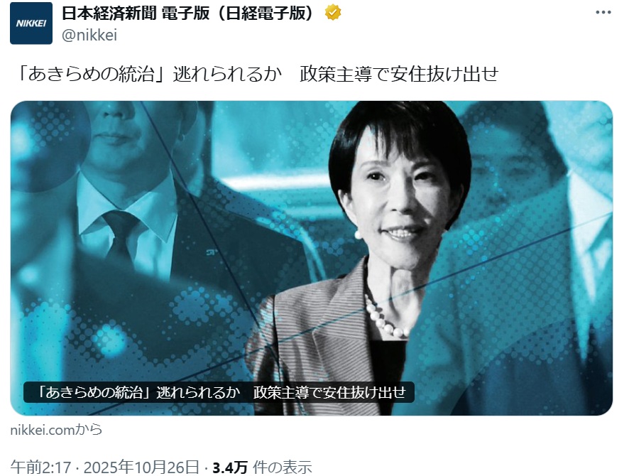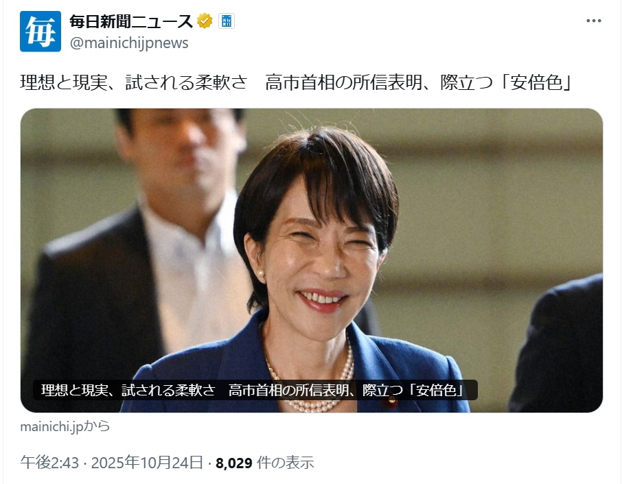 ・・・所信表明の内容から読み取れるサナエのファシスト政治家としての危険性は一切触れず、安倍の理想を受け継いだこと、野党とのバランスに苦労してるという論調でふんわり包んでごまかしていると思う。