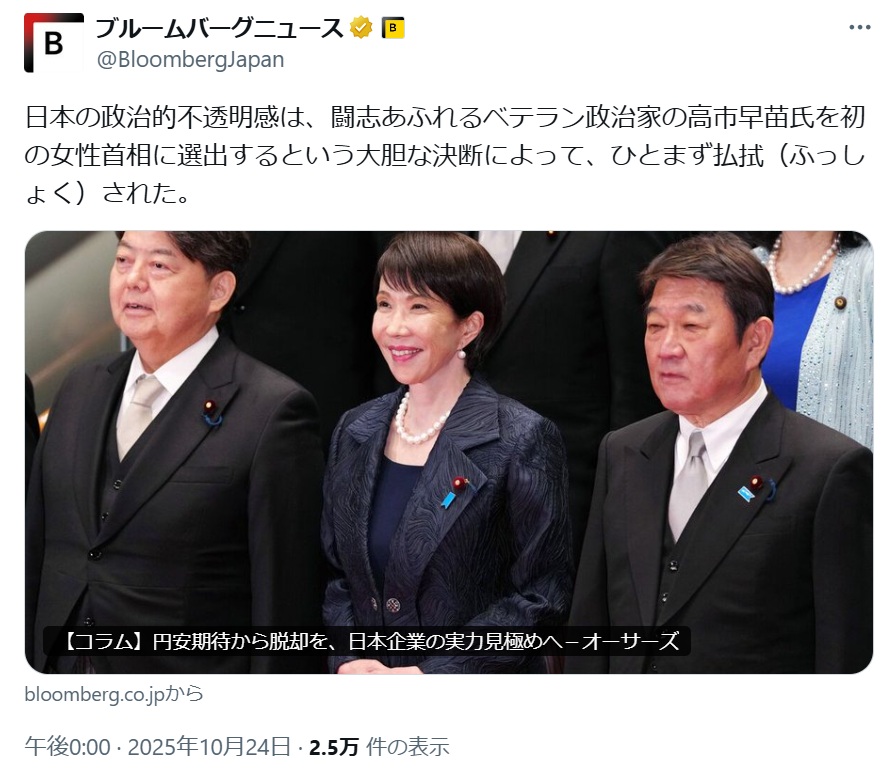 約3週間前の自民党総裁選で勝利するまで、高市氏の首相就任は極めて可能性が低いとみられていた。その後、自民党と公明党の連立が崩れるという試練の後、新たな連立パートナーを得て首相の座に就いた。歴史的な展開となったが、市場は何を織り込むべきだろうか。