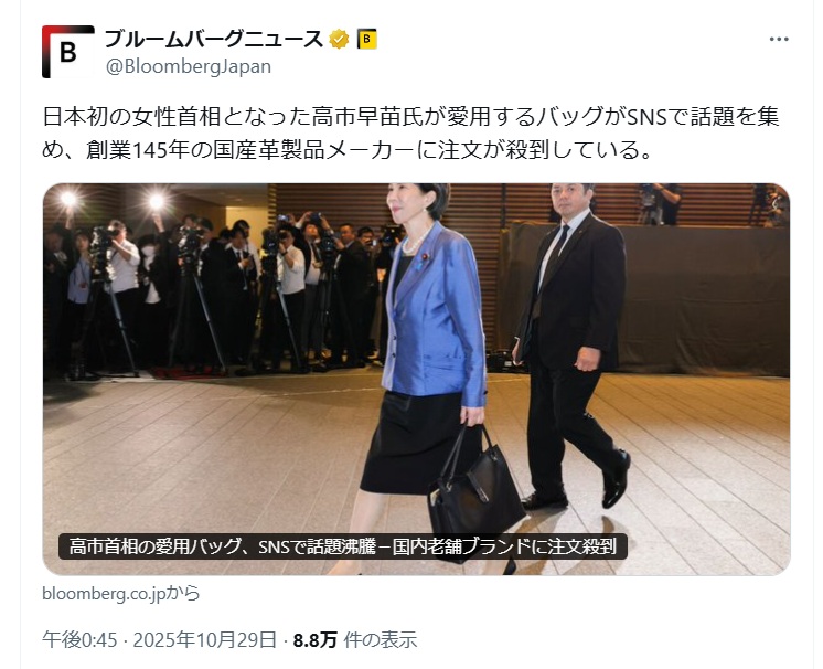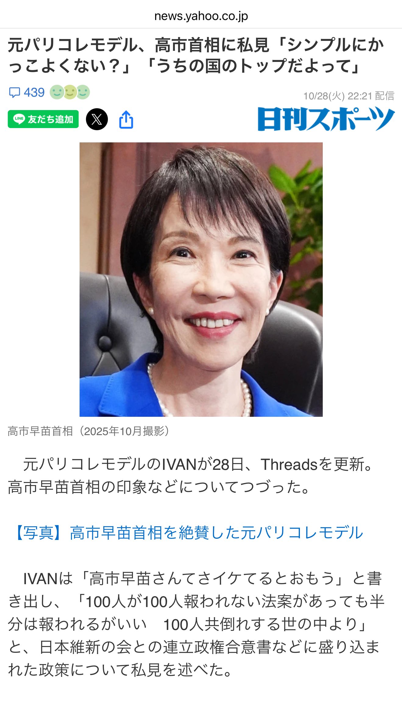 元パリコレモデル、高市首相に私見「シンプルにかっこよくない?」「うちの国のトップだよって(日刊スポーツ)