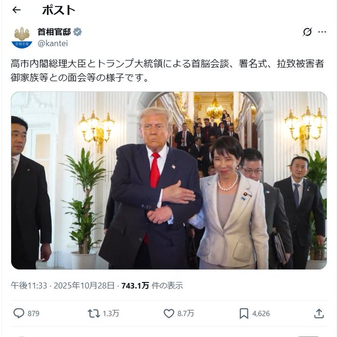 高市内閣総理大臣とトランプ大統領による首脳会談、署名式、拉致被害者御家族等との面会等の様子です。 pic.twitter.com/tvJYpanIDl