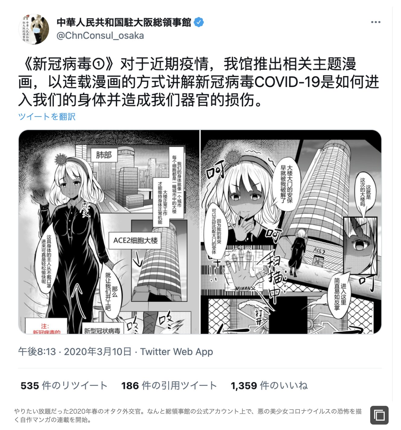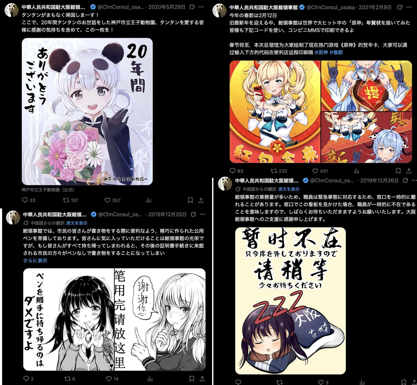 話題の中国大阪総領事館だが、実は前任のtwitter(当時)担当が仕事に不真面目かつガチめなオタクで総領事館アカで自作イラスト上げて公私混同してたという、知ってる人らには有名な話なんだが、この路線ずっと続けられてたら今ごろ対日本認知戦における最大戦力化してたろと思わざるを得ない。