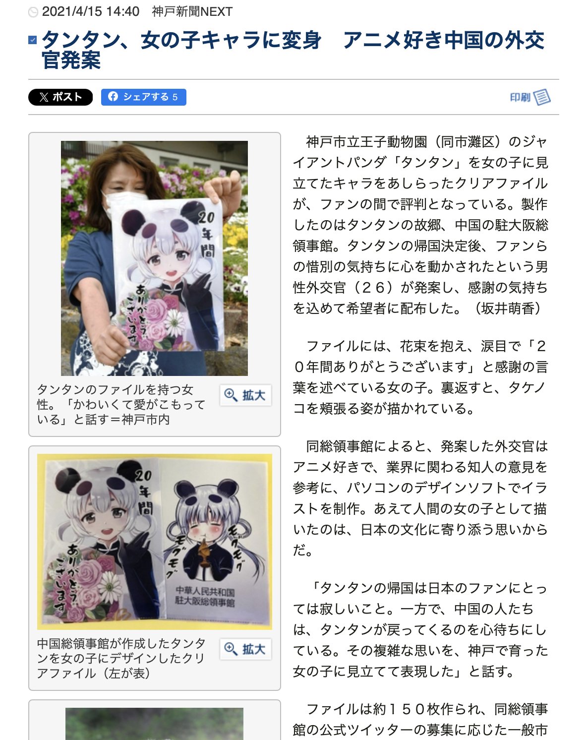 「仕事に不真面目」というのはイメージで適当に言っちゃった所あんだが、領事館の公式アカを半私物化して、自作漫画の連載始めようとしたり自作のパンダ擬人化キャラをグッズ化して配布したりと、オタクライフ全力謳歌してたのはマジなんすよね中国大阪総領事館twitter(当時)アカウント。