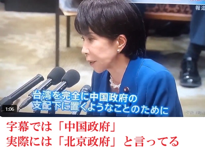 字幕では「中国政府」と修正されているが発言は「中国北京政府」だ。