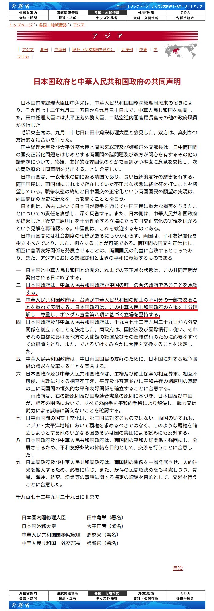 三・中華人民共和国政府は、台湾が中華人民共和国の領土の不可分の一部であることを重ねて表明する。日本国政府は、この中華人民共和国政府の立場を十分理解し、尊重し、ポツダム宣言第八項に基づく立場を堅持する。