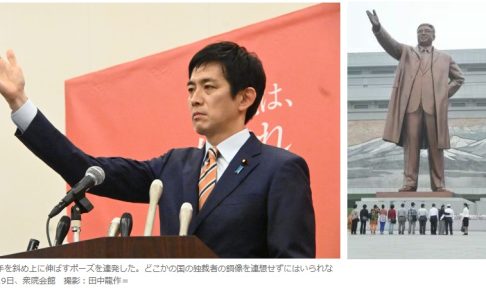 初の総裁選出馬会見で、「金日成のポーズ」で天下布武を宣言。
