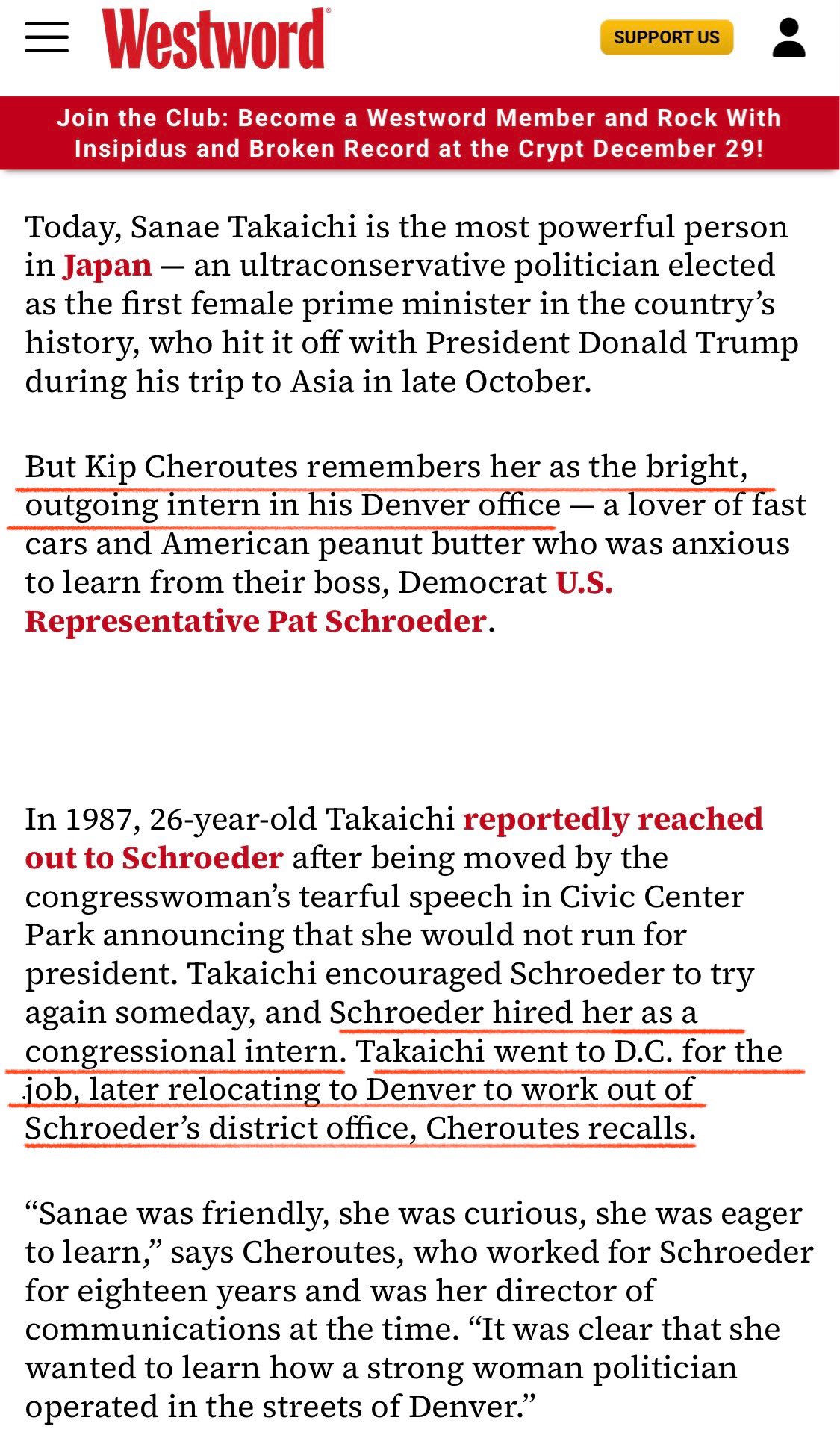 コロラド州地元紙「 パット・シュローダーの元インターン」