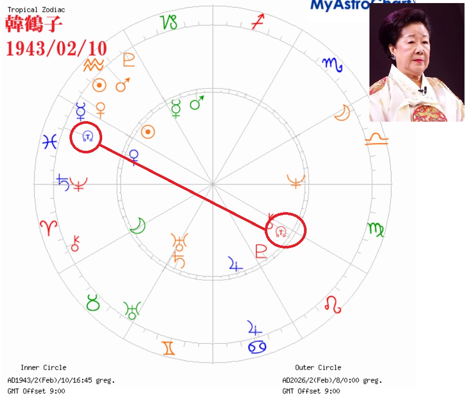 ・・・イランのハメネイ氏の場合は、この天王星同士の相が溶けて解除されていましたが、韓鶴子の場合はまだ影響が続いています。解散命令が出るでしょう。