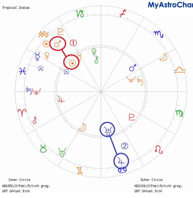 ①先天の太陽(自分)と進行の火星(紛争、事故、トラブル)が0度合