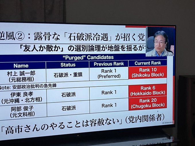 前回の選挙では温情をかけて公認してくれたゲルに近い候補者、村上元総務相をはじめ反安倍発言をしたり気に入らない議員の比例順位を下げたらしい。